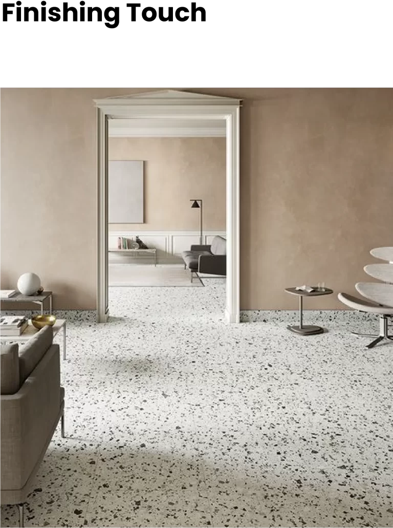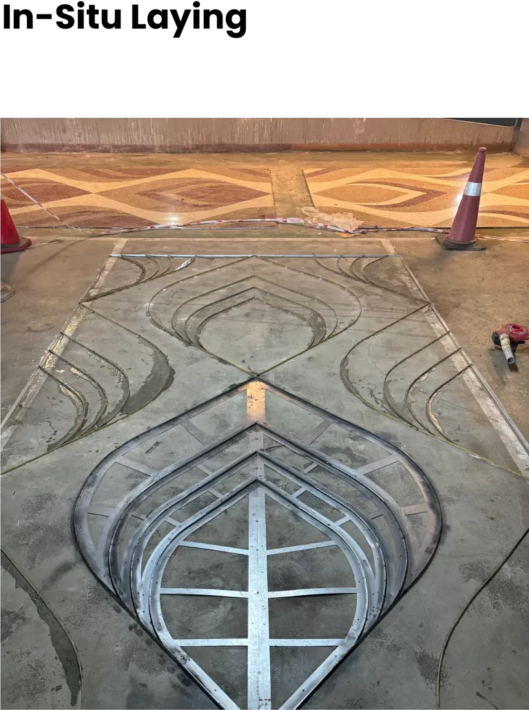 Our meticulous process begins with client co-creation to select the colours, draft patterns, and finalise placements. This is followed by a thorough site assessment by our experts and surface preparation for optimal results. We then prepare and transport the approved terrazzo pre-mix, expertly apply it on-site, and finish with griding, polishing, and sealing to ensure a seamless, durable, and beautiful finish.